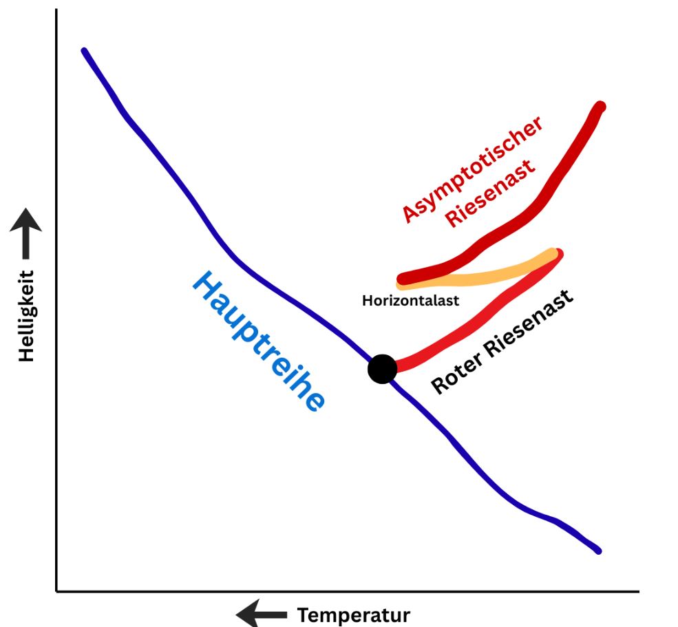 Als ich vorhin von dem erzählt habe, was in den späten Phasen eines Sternenlebens passiert, habe ich auch immer wieder gesagt, dass die Leuchtkraft sinkt oder die Temperatur steigt, und so weiter. Das heißt aber auch: Wenn ein Stern in diese Endphase seines Lebens kommt, dann fängt er an, im Hertzsprung-Russell-Diagramm herumzuwandern. Die erste Phase die ich beschrieben habe, war die der Roten Riesen: Ein Stern wird kühler und gleichzeitig heller, weil er sich aufbläht. Im Hertzsprung-Russell-Diagramm entspricht das also einer Linie, die vom Startpunkt irgendwo auf der Hauptreihe nach rechts oben verläuft. Wenn dann der Heliumblitz einsetzt, wird der Stern ein klein wenig heißer und kaum noch heller. Er wandert im Diagramm jetzt also wieder ein Stück nach links und gleichzeitig nur wenig oder gar nicht nach oben. Die Linie knickt also fast horizontal nach links ab. Dann, wenn auch die Heliumschalen zu fusionieren beginnen, bläht sich der Stern wieder auf, wird wieder heller und kühler – und folgt im Laufe der Zeit einer Linie, die erneut nach rechts oben im Diagramm verläuft, fast parallel zur ersten Linie der er während der Phase als roter Riese gefolgt ist.